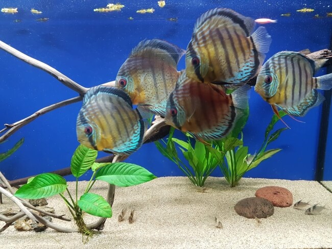 Peces | 5 Discos salvajes verdes (Symphysodon Aequifasciatus Aequifasciatus PELLEGRIN 1904), Origen exacto desconocido. Tamaño: 15 – 16 cm. 11 Corydoras Agassizi salvajes, un Plecostomus pequeño y 5 camarones transparentes. |