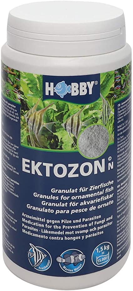 Ektozon es un producto de la marca Hobby. Se presenta como granulado que hay que disolver. Está indicado para tratar preventivamente o como curativo, doblando la dosificación. Trata tanto parásitos (chilodonella y protozoos cutáneos), como hongos (micosis, saprolegnia, achlya) y se recomienda para heridas de todo tipo.