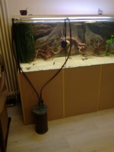 Con esto se acabaron los cambios de agua y la dedicación enorme de tiempo. Yo me pongo la alarma del móvil para apagar el filtro de lecho mixto. No me voy de casa en ese tiempo, claro. En mi caso, una hora y media por semana. Eso es lo que gasto en «cambiar agua sentado frente al acuario», ¡semanalmente! Sí, a mitad de semana le añado agua evaporada y 10 ml de ácido húmico, 10 minutos.